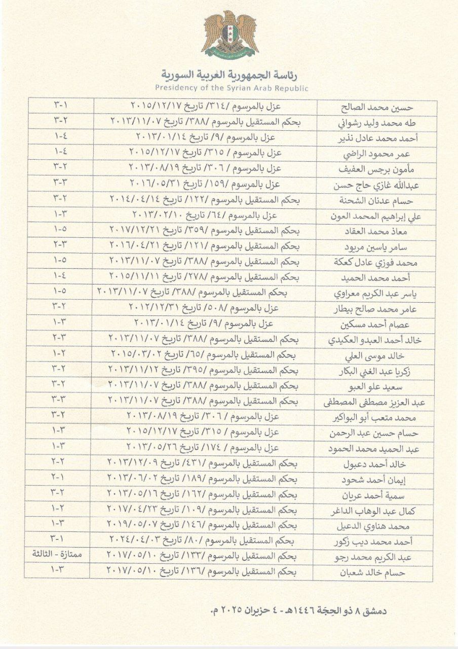 مرسوم رئاسي رقم (70) يقضي بطي مراسيم العزل وبحكم المستقيل الصادرة بحق القضاة التالية أسماؤهم وإعادتهم إلى العمل القضائي.