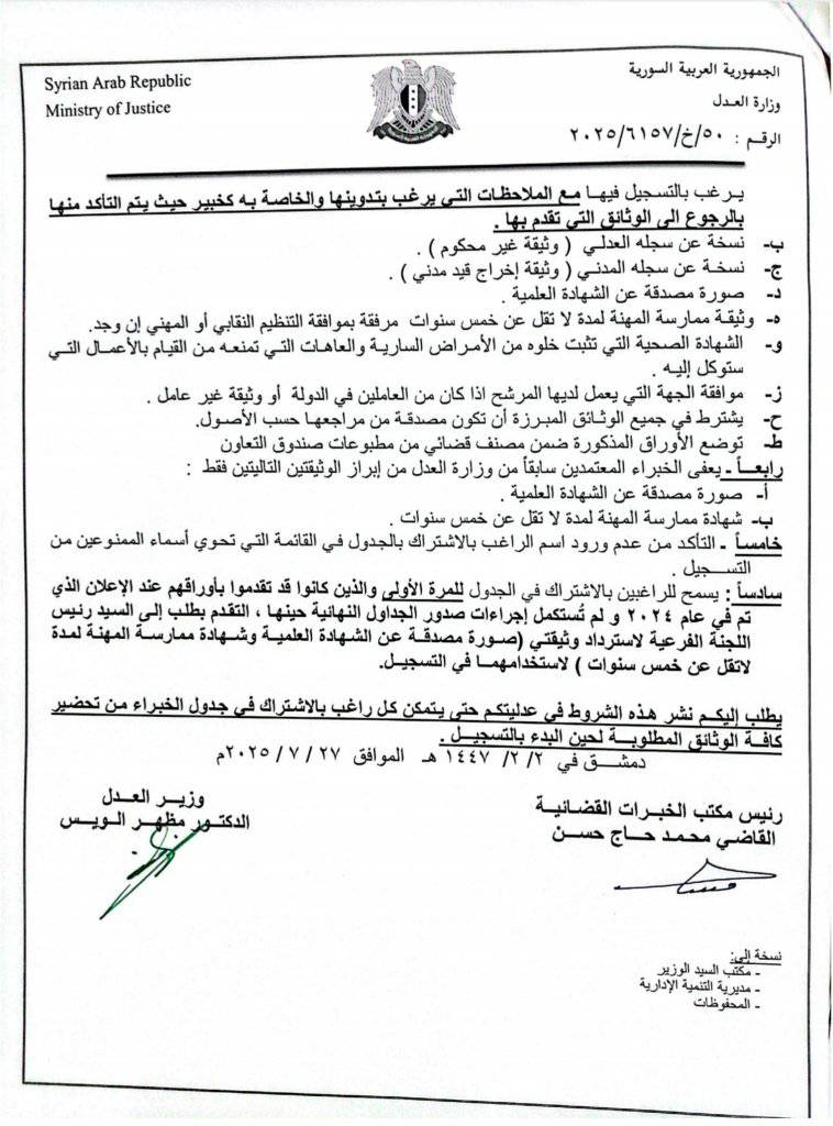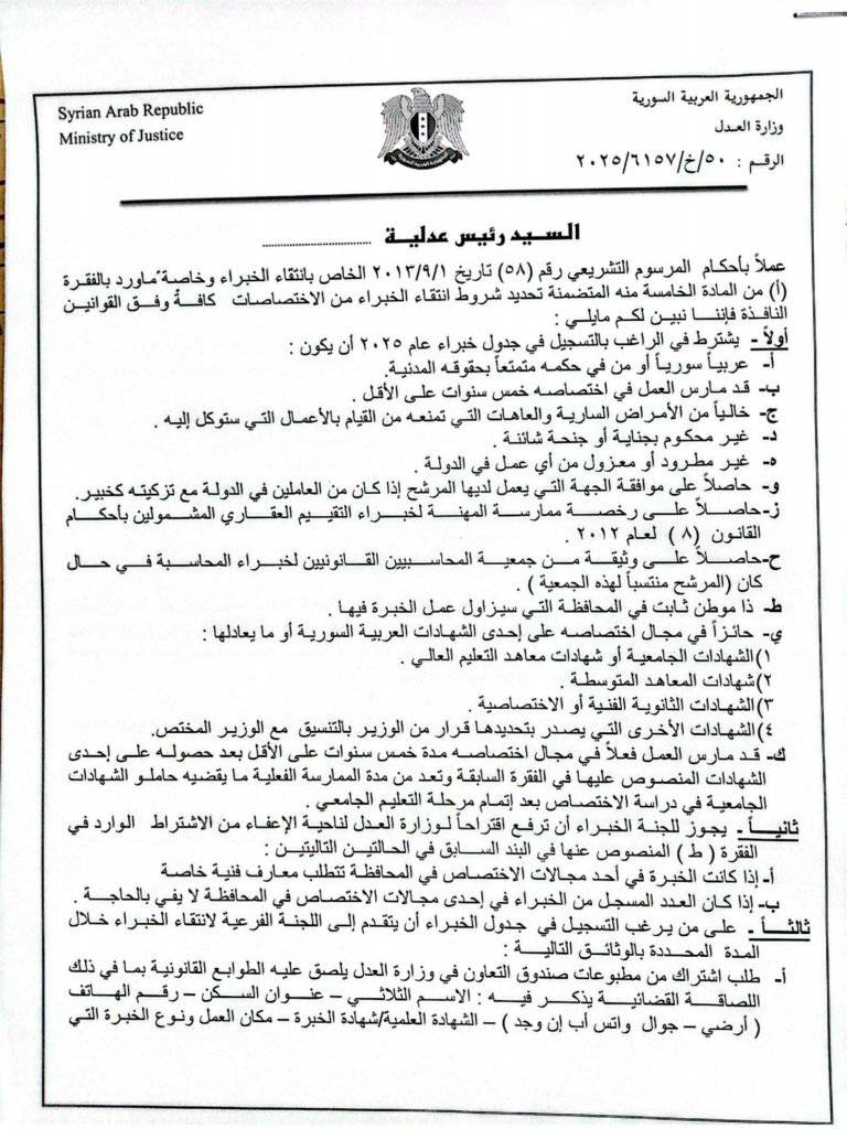 يطلب إليكم نشر هذه الشروط في عدليتكم حتى يتمكن كل راغب بالاشتراك في جدول الخبراء من تحضير كافة الوثائق المطلوبة لحين البدء بالتسجيل .