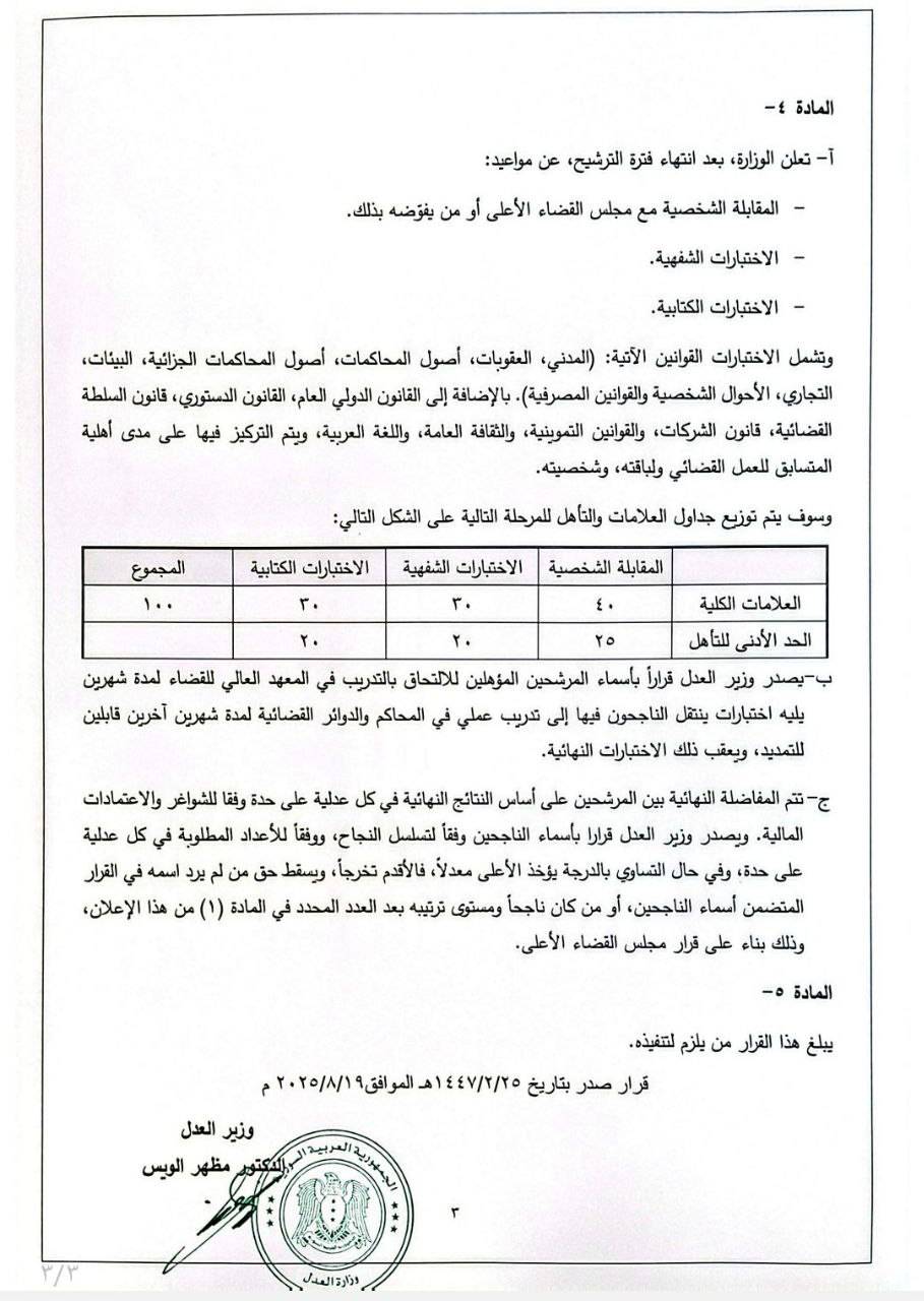 ب يصدر وزير العدل قراراً بأسماء المرشحين المؤهلين للالتحاق بالتدريب في المعهد العالي للقضاء لمدة شهرين يليه اختبارات ينتقل الناجحون فيها إلى تدريب عملي في المحاكم والدوائر القضائية لمدة شهرين آخرين قابلين للتمديد، ويعقب ذلك الاختبارات النهائية.