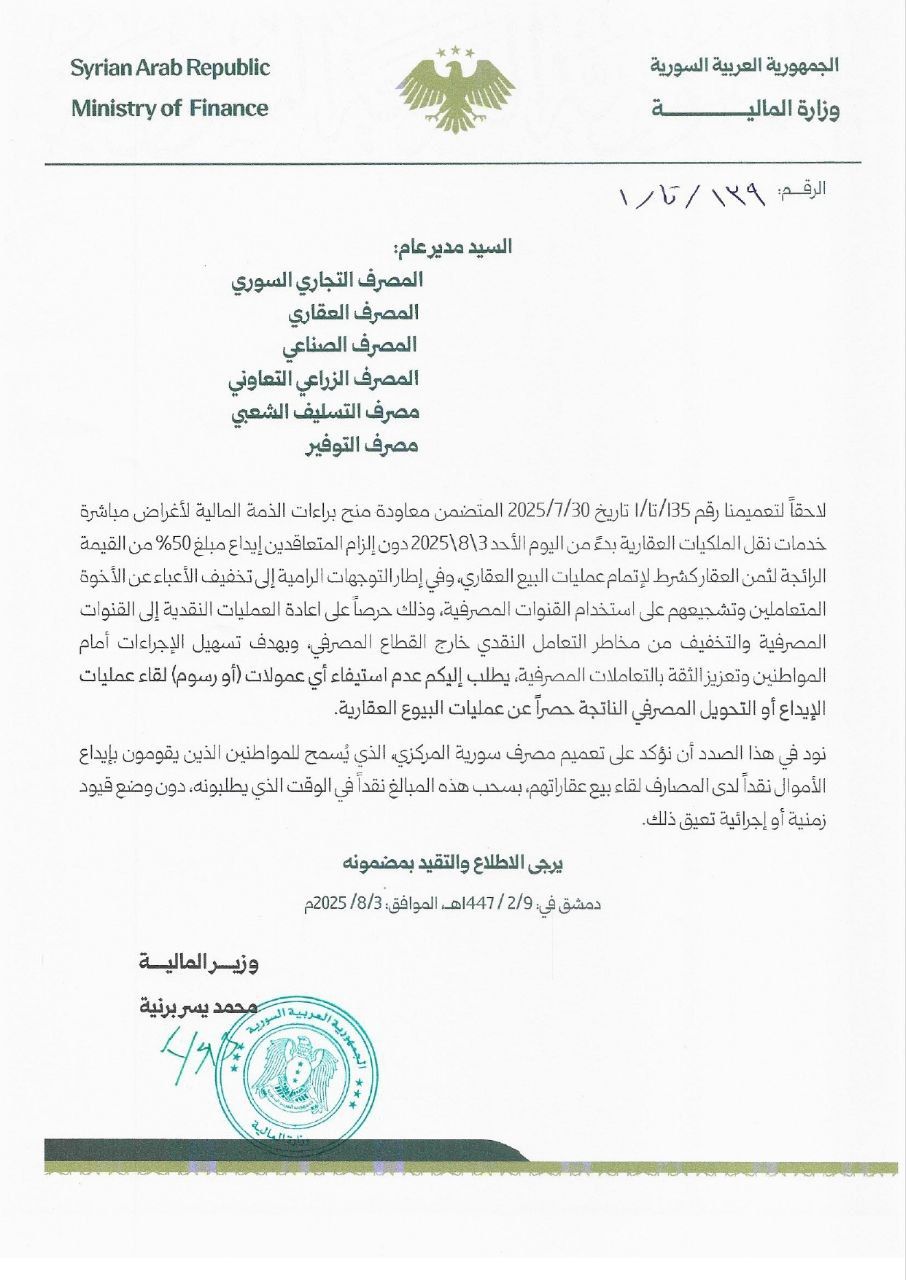 لاحقاً لتعميمنا رقم 135/ تا /1 تاريخ 2025/7/30 المتضمن معاودة منح براءات الذمة المالية لأغراض مباشرة خدمات نقل الملكيات العقارية بدءً من اليوم الأحد 3\8\2025 دون إلزام المتعاقدين إيداع مبلغ 50% من القيمة الرائجة لثمن العقار كشرط لإتمام عمليات البيع العقاري، وفي إطار التوجهات الرامية إلى تخفيف الأعباء عن الأخوة المتعاملين وتشجيعهم على استخدام القنوات المصرفية، وذلك حرصاً على اعادة العمليات النقدية إلى القنوات المصرفية والتخفيف من مخاطر التعامل النقدي خارج القطاع المصرفي، وبهدف تسهيل الإجراءات أمام المواطنين وتعزيز الثقة بالتعاملات المصرفية، يطلب إليكم عدم استيفاء أي عمولات (أو رسوم) لقاء عمليات الإيداع أو التحويل المصرفي الناتجة حصراً عن عمليات البيوع العقارية.