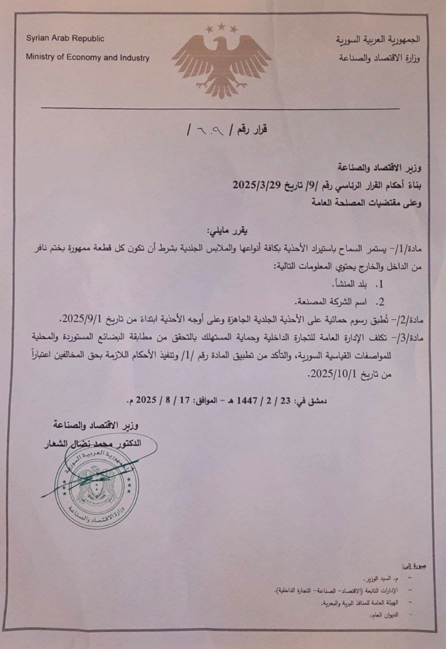 مادة /2/ تُطبق رسوم حمائية على الأحذية الجلدية الجاهزة وعلى أوجه الأحذية ابتداءً من تاريخ 2025/9/1.