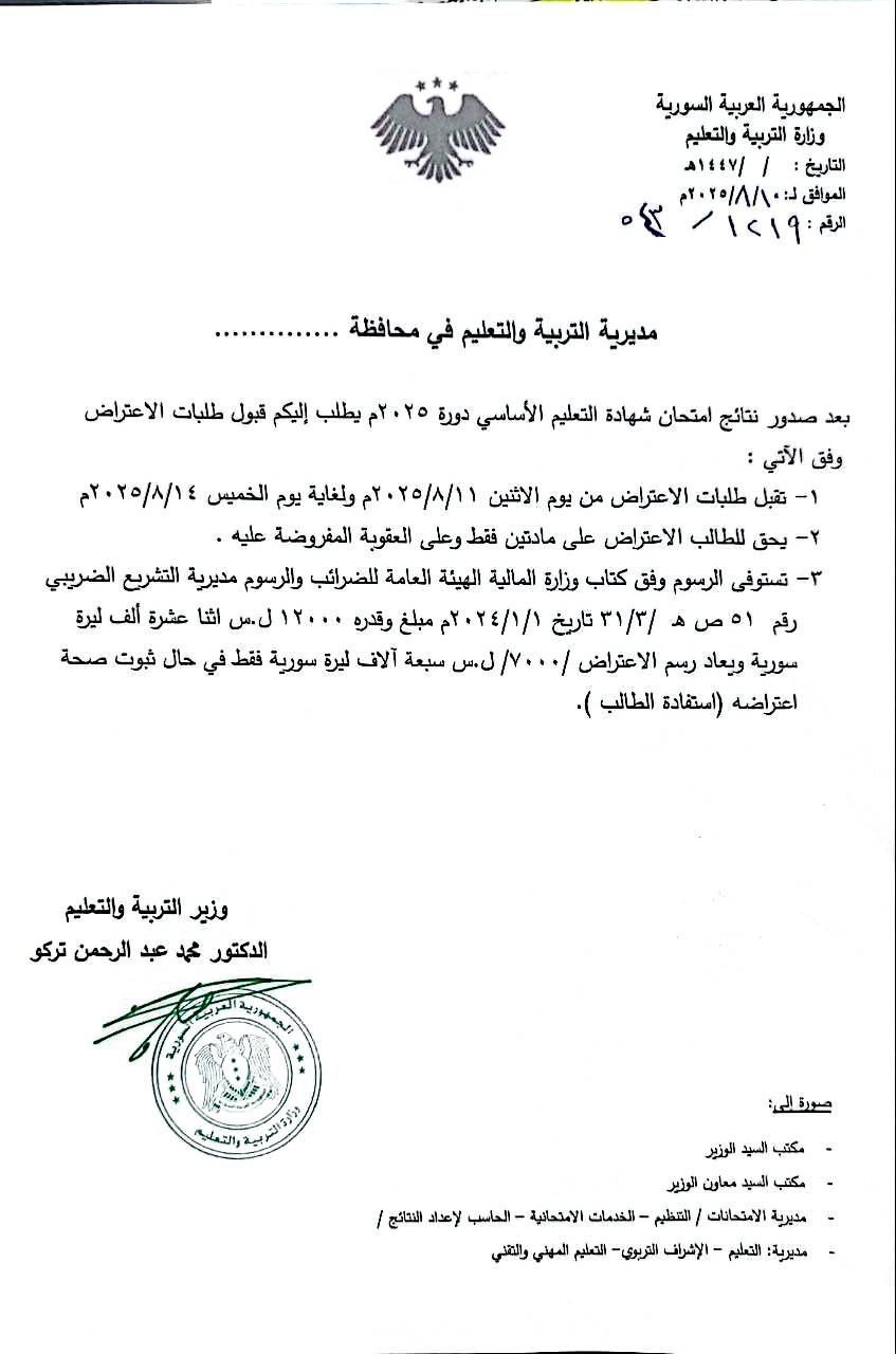 وزارة التربية والتعليم: الإعلان عن بدء قبول طلبات الاعتراض على نتائج مواد شهادة التعليم الأساسي اعتباراً من يوم الإثنين 11 آب ولغاية الخميس 14 آب 2025