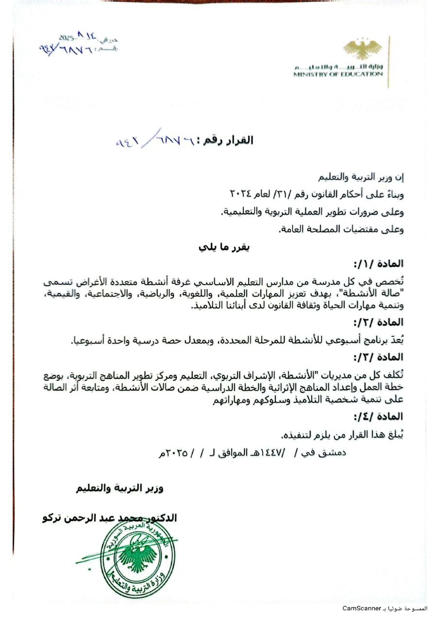 وزارة التربية والتعليم: قرار بتخصيص غرفة تسمى صالة الأنشطة في كل مدرسة من مدارس التعليم الأساسي