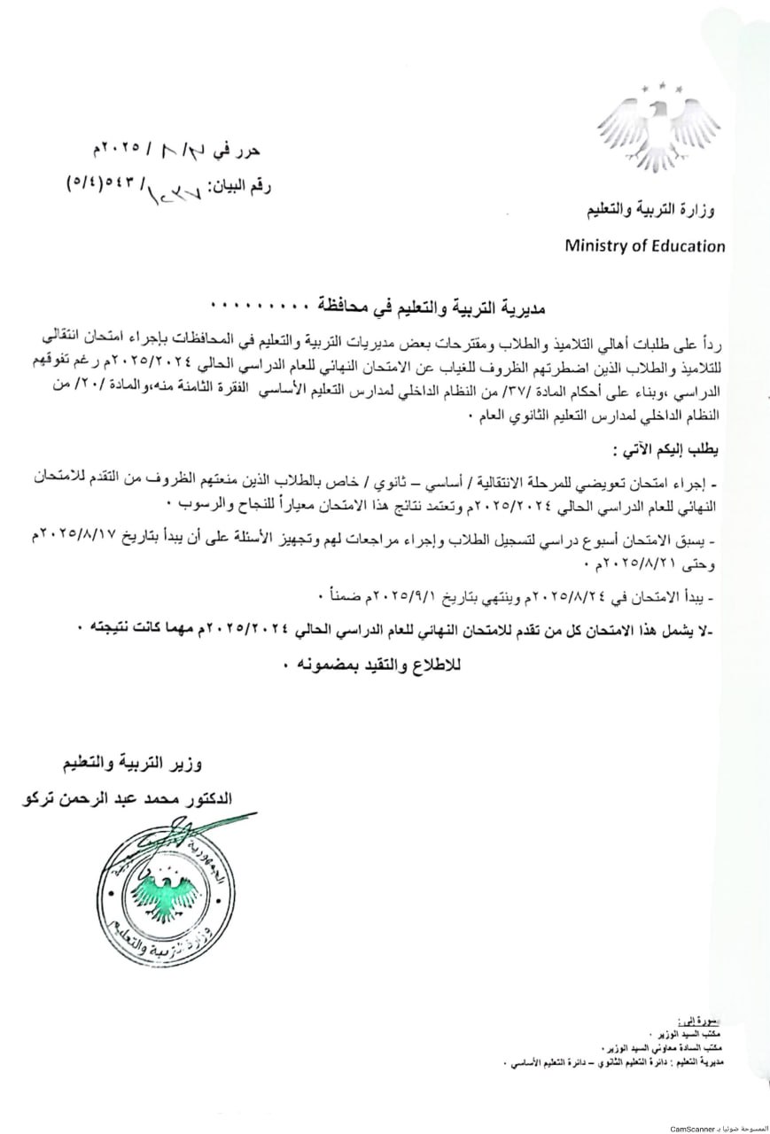 رداً على طلبات أهالي التلاميذ والطلاب ومقترحات بعض مديريات التربية والتعليم في المحافظات بإجراء امتحان انتقالي للتلاميذ والطلاب الذين اضطرتهم الظروف للغياب عن الامتحان النهائي للعام الدراسي الحالي ٢٠٢٥/٢٠٢٤م رغم تفوقهم الدراسي ، وبناء على أحكام المادة / ۳۷/ من النظام الداخلي لمدارس التعليم الأساسي الفقرة الثامنة منه، والمادة / ٢٠/ من النظام الداخلي لمدارس التعليم الثانوي العام .