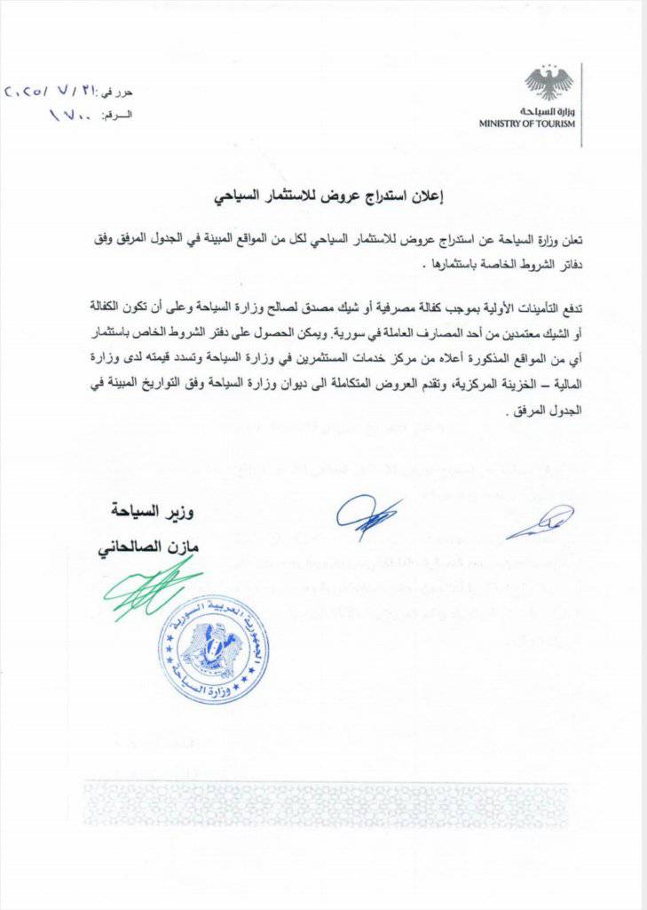 تعلن وزارة السياحة عن استدراج عروض للاستثمار السياحي لكل من المواقع المبينة في الجدول المرفق وفق دفاتر الشروط الخاصة باستثمارها .