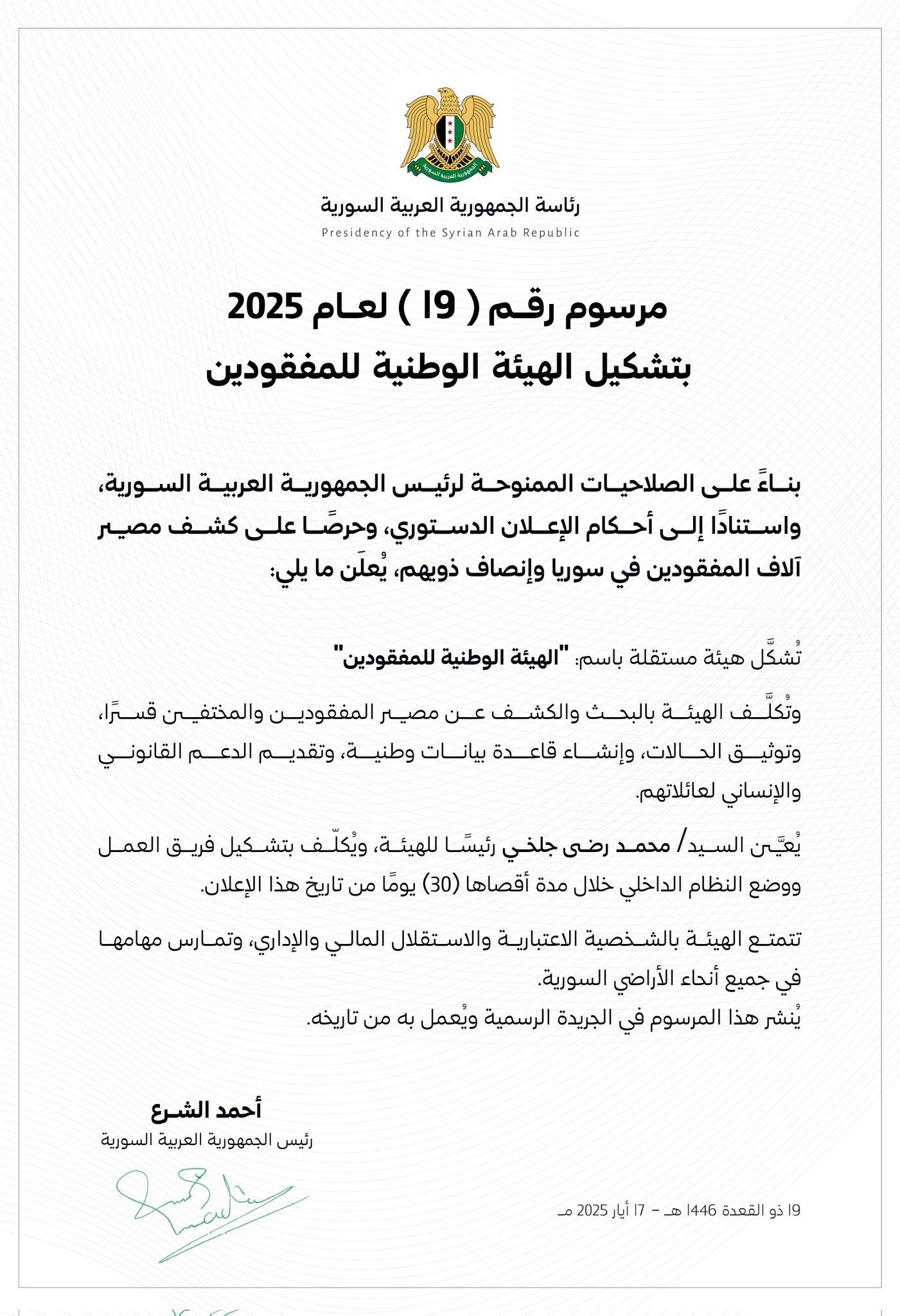 مرسوم رقم (19) لعام 2025 بتشكيل الهيئة الوطنية للمفقودين