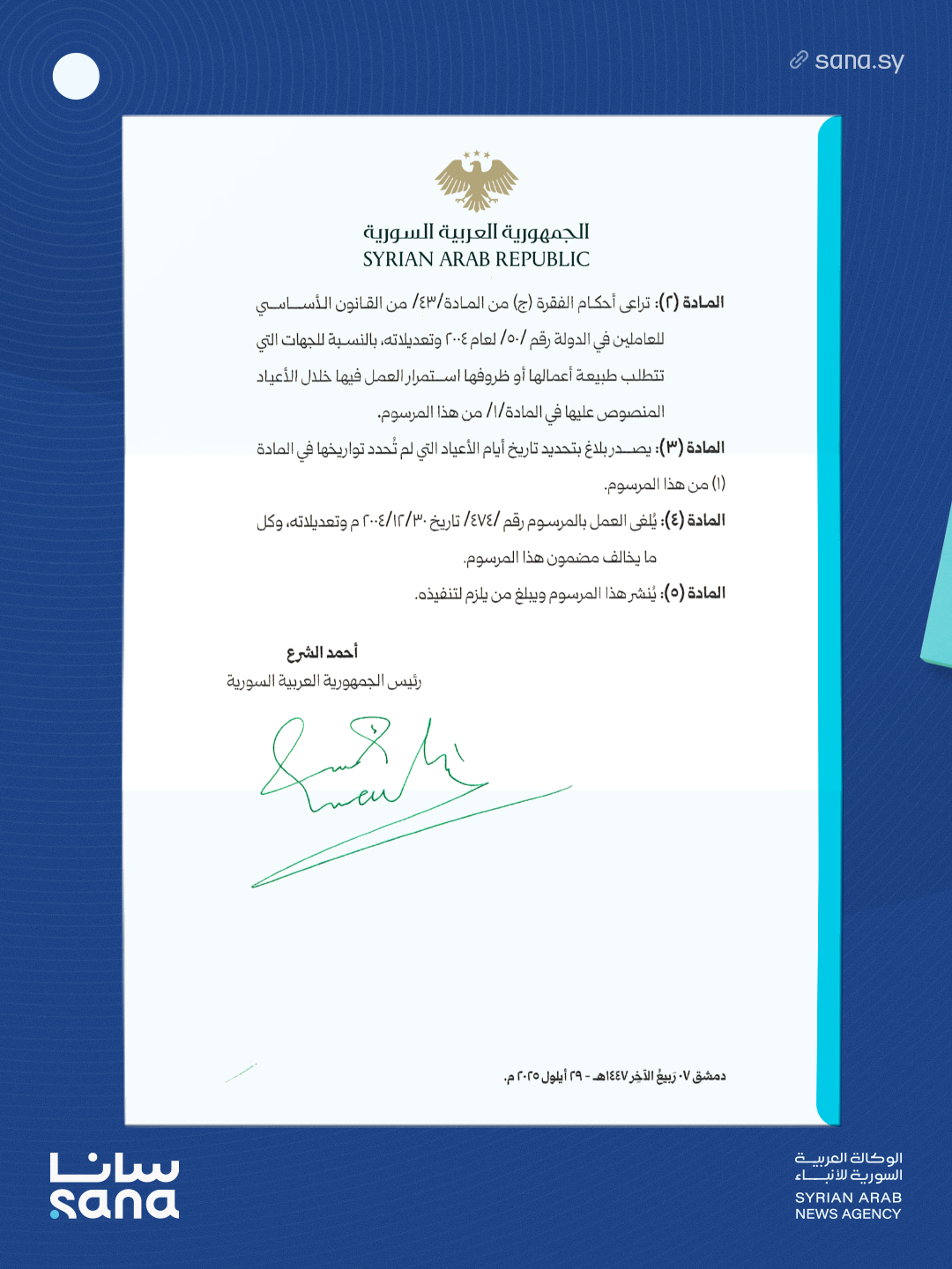 مرسوم رئاسي يقضي بتحديد الأعياد الرسمية في سوريا