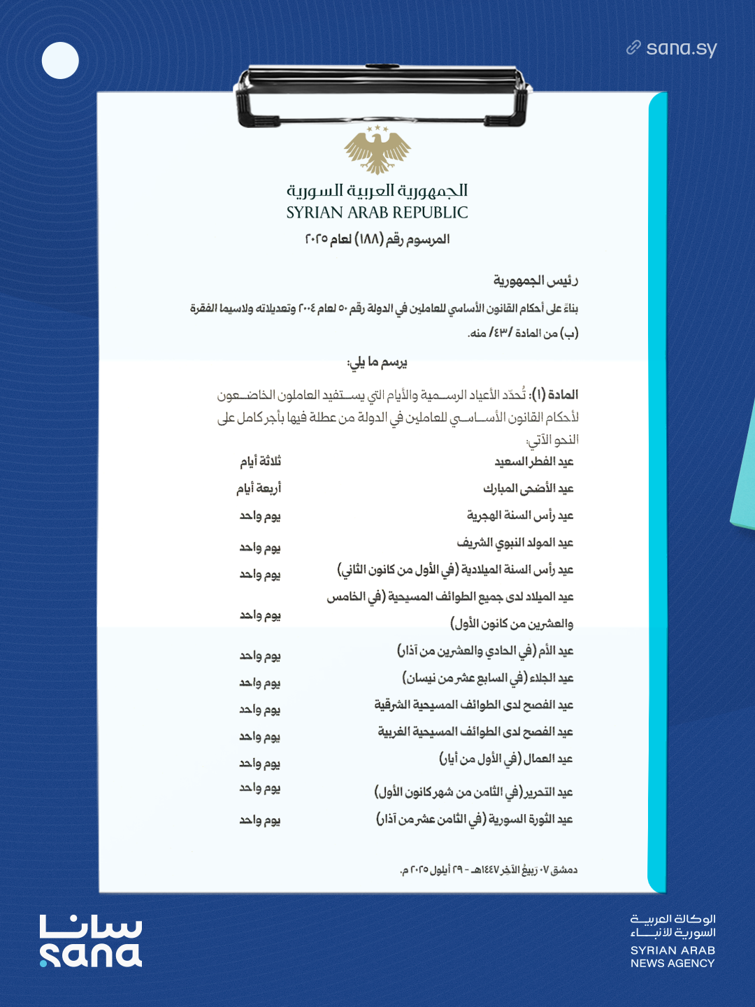 المرسوم 188 لعام 2025: تحديد الأعياد الرسمية في سورية