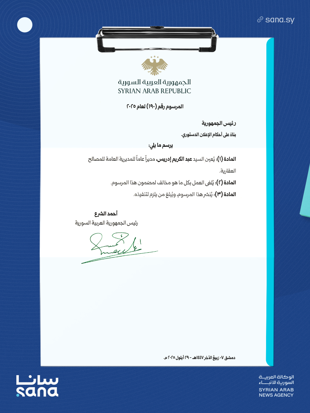 الرئيس الشرع يصدر مرسوماً بتعيين عبد الكريم إدريس مديراً عاماً للمصالح العقارية