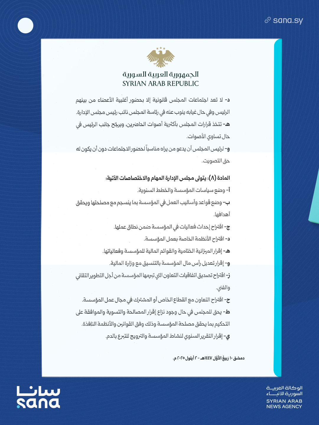 المادة (8): يتولى مجلس الإدارة المهام والاختصاصات الآتية: