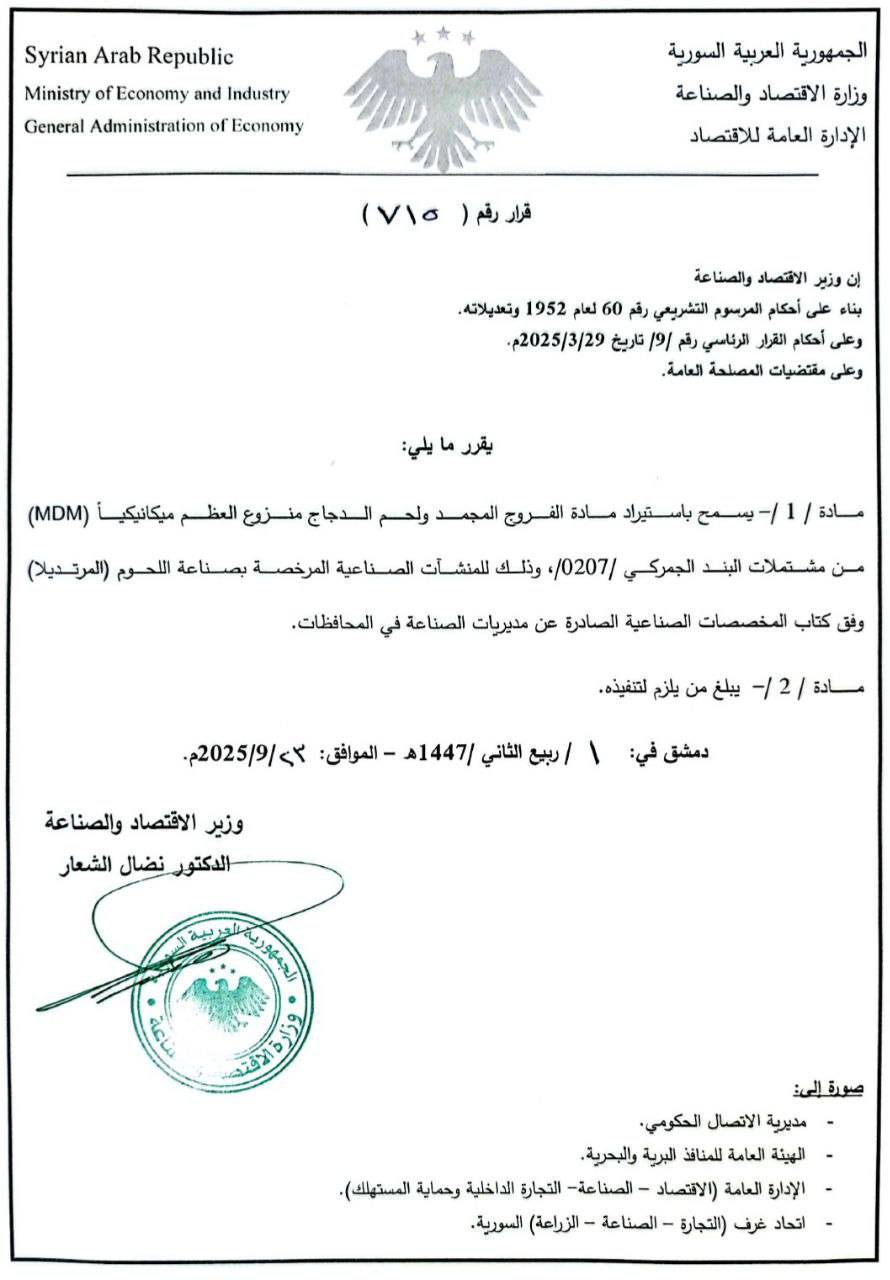 مادة / 1 / - يسمح باستيراد مادة الفروج المجمد ولحم الدجاج منزوع العظم ميكانيكياً (MDM) من مشتملات البند الجمركي /0207 ، وذلك للمنشآت الصناعية المرخصة بصناعة اللحوم (المرتديلا) وفق كتاب المخصصات الصناعية الصادرة عن مديريات الصناعة في المحافظات.