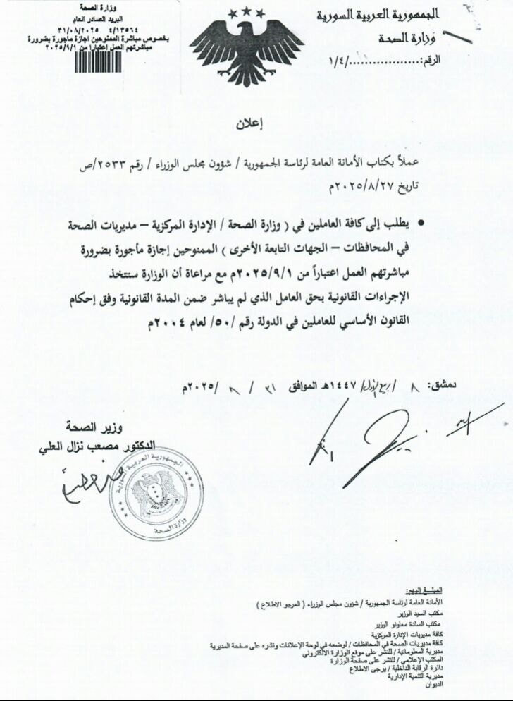 . يطلب إلى كافة العاملين في ) وزارة الصحة / الإدارة المركزية - مديريات الصحة في المحافظات - الجهات التابعة الأخرى ( الممنوحين إجازة مأجورة بضرورة مباشرتهم العمل اعتباراً من ۲۰۲٥/٩/١م مع مراعاة أن الوزارة ستتخذ الإجراءات القانونية بحق العامل الذي لم يباشر ضمن المدة القانونية وفق إحكام القانون الأساسي للعاملين في الدولة رقم / ٥٠ / لعام ٢٠٠٤م