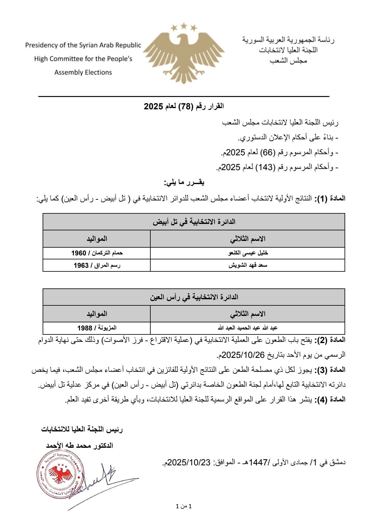 اللجنة العليا لانتخابات مجلس الشعب: قرار رقم 78 لعام 2025 نتائج انتخابات رأس العين وتل أبيض