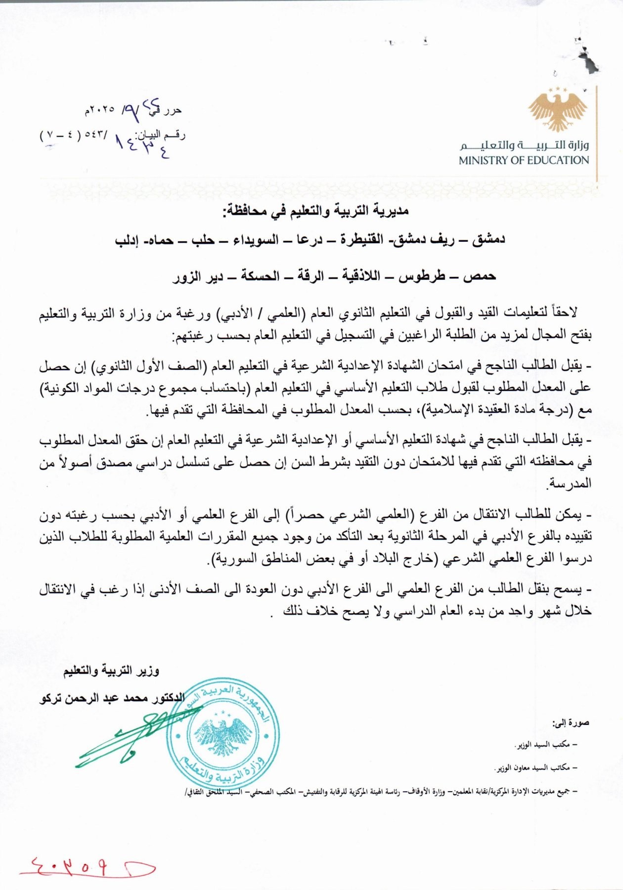 - يمكن للطالب الانتقال من الفرع العلمي الشرعي حصراً إلى الفرع العلمي أو الأدبي بحسب رغبته دون تقييده بالفرع الأدبي في المرحلة الثانوية بعد التأكد من وجود جميع المقررات العلمية المطلوبة للطلاب الذين درسوا الفرع العلمي الشرعي خارج البلاد أو في بعض المناطق السورية).