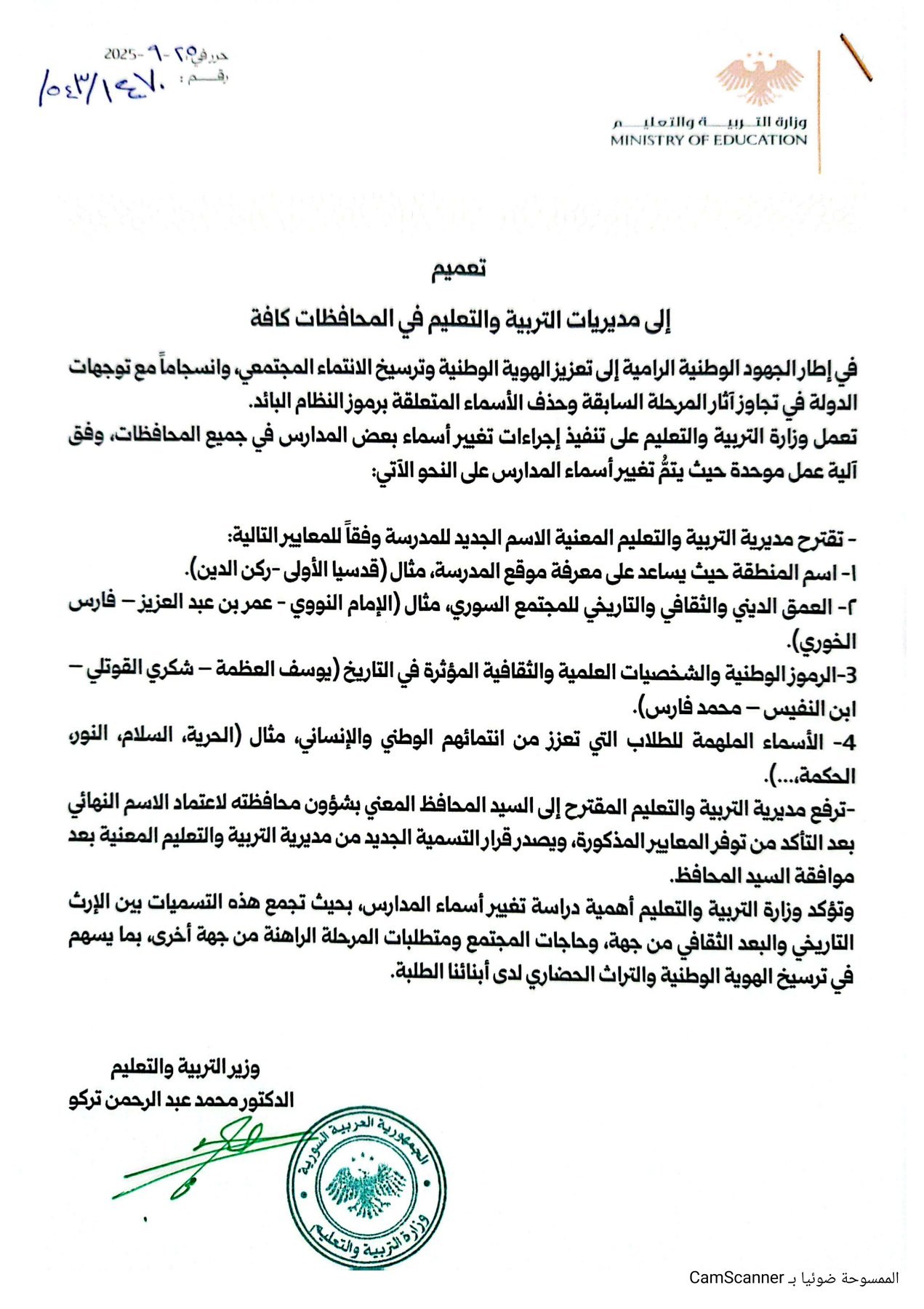 في إطار الجهود الوطنية الرامية إلى تعزيز الهوية الوطنية وترسيخ الانتماء المجتمعي، وانسجاماً مع توجهات الدولة في تجاوز آثار المرحلة السابقة وحذف الأسماء المتعلقة برموز النظام البائد.