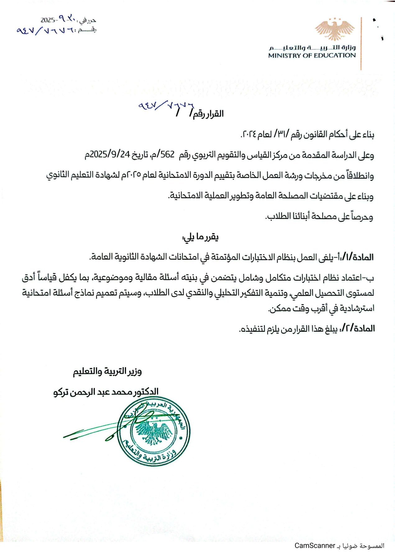 المادة /١/: أ - يلغى العمل بنظام الاختبارات المؤتمتة في امتحانات الشهادة الثانوية العامة.