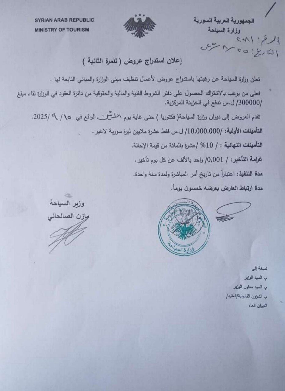 وزارة السياحة: الإعلان عن استدراج عروض لأعمال تنظيف مبنى الوزارة والمباني التابعة لها، للراغبين بالاشتراك الحصول على دفتر الشروط من دائرة العقود في الوزارة.