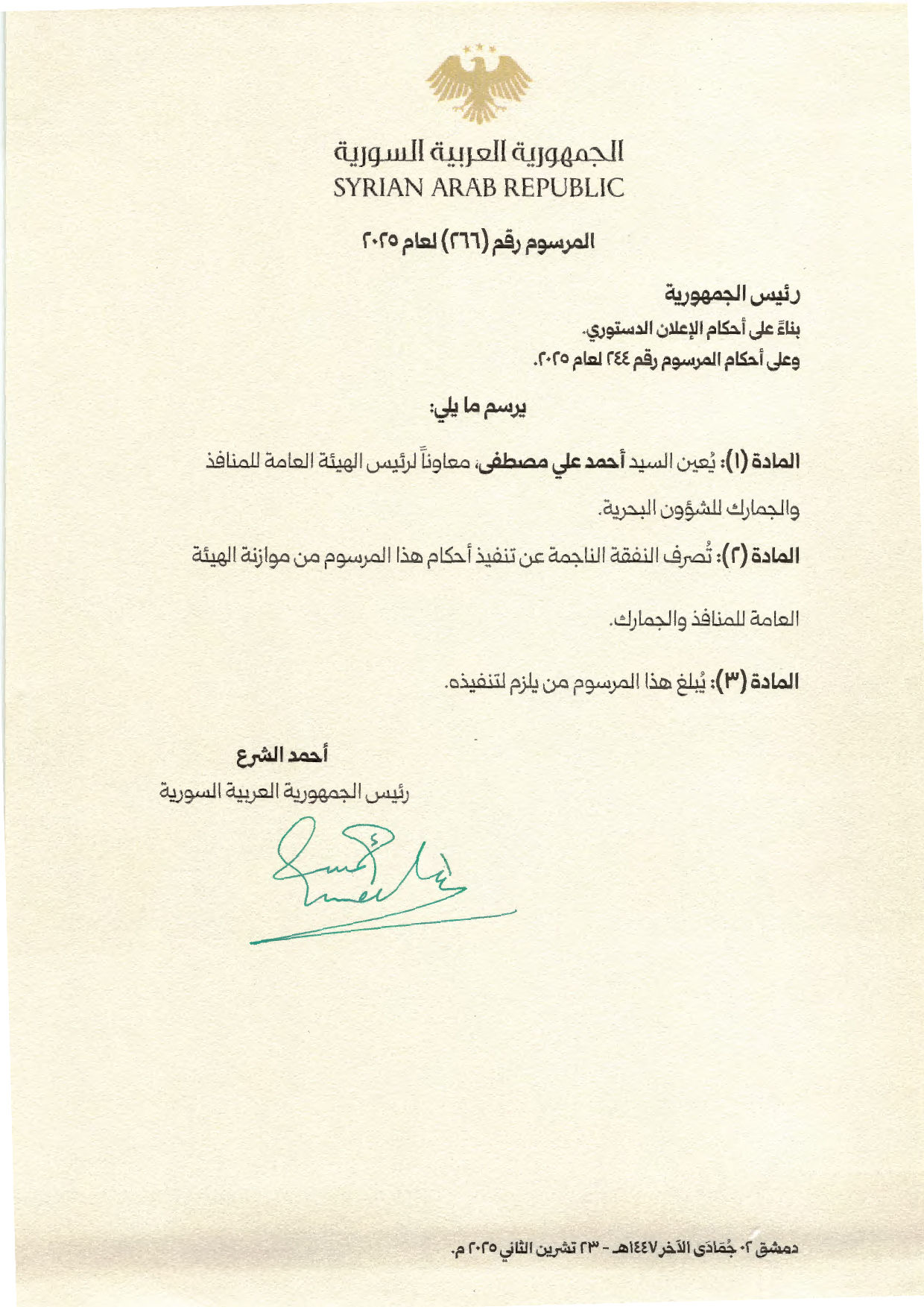 كما أصدر الرئيس الشرع المرسوم (266) لعام 2025، القاضي بتعيين أحمد علي مصطفى معاوناً لرئيس الهيئة العامة للمنافذ والجمارك للشؤون البحرية.