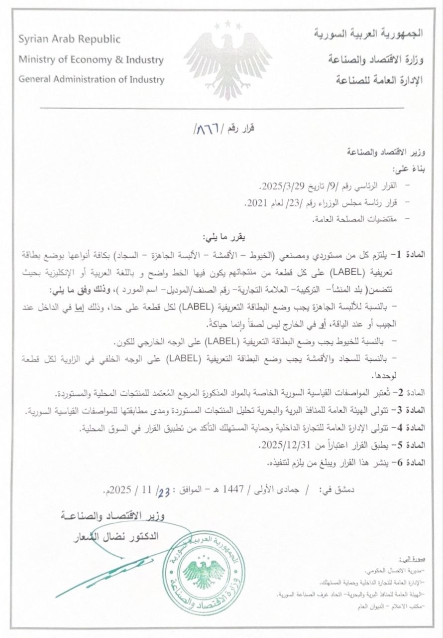 وزارة الاقتصاد والصناعة : قرار بإلزام مستوردي ومصنّعي الخيوط والأقمشة والألبسة والسجاد بوضع بطاقات تعريفية للمنتجات