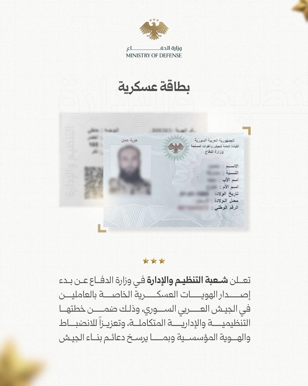 إعلان بدء إصدار الهويات العسكرية للعاملين في صفوف الجيش العربي السوري