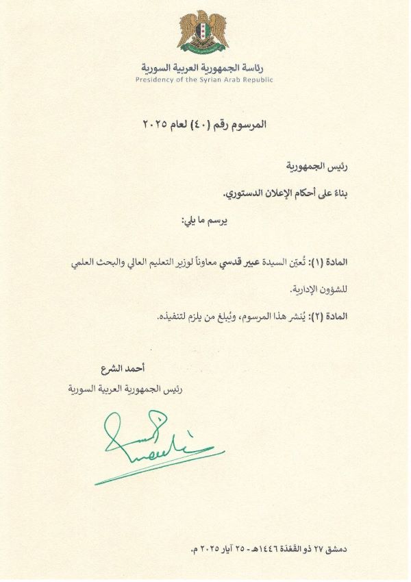 مرسوم من رئاسة الجمهورية رقم (40) لعام 2025، يقضي بتعيين السيدة عبير قدسي معاوناً لوزير التعليم العالي والبحث العلمي للشؤون الإدارية.