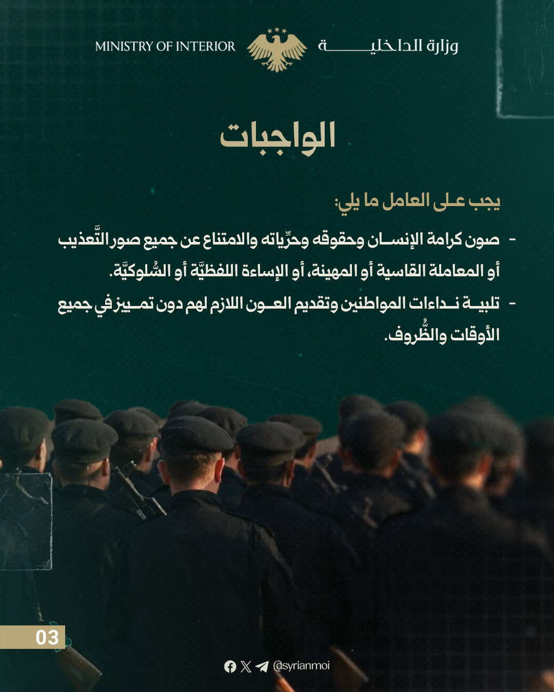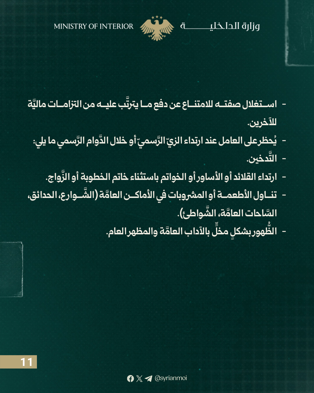 يحظر على العامل توثيق أو تصوير أو نشر أي نشاط أو موقع أو عنصر أمني أو إداري تابع للوزارة باستخدام الهاتف الشخصي أو أي جهاز تصوير دون موافقة الوزير أو من يفوضه.