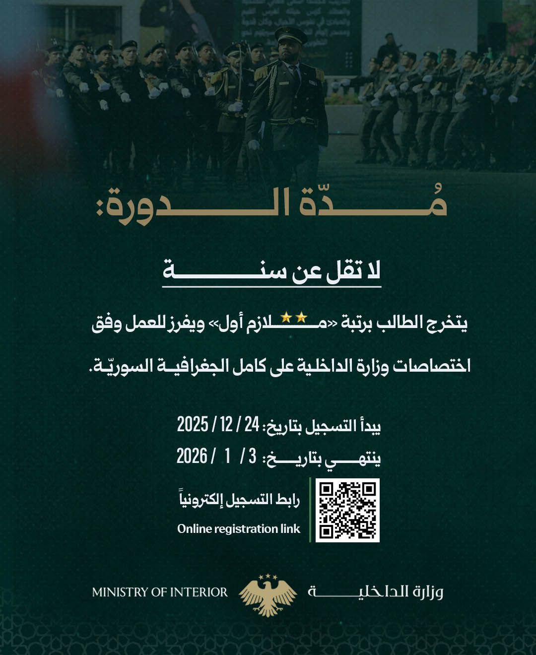 وزارة الداخلية تعلن فتح باب التسجيل في دورة طلاب الضباط الأولى بعد التحرير لعام 2026