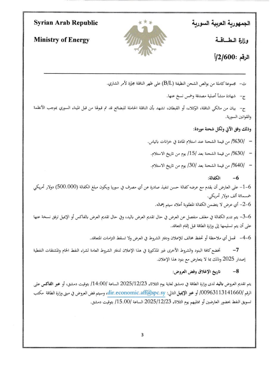 وسيتم فض العروض في مبنى وزارة الطاقة – مكتب تسويق النفط بحضور العارضين أو من يمثلهم يوم الثلاثاء 2025/12/23 الساعة /15:00/ بتوقيت دمشق.