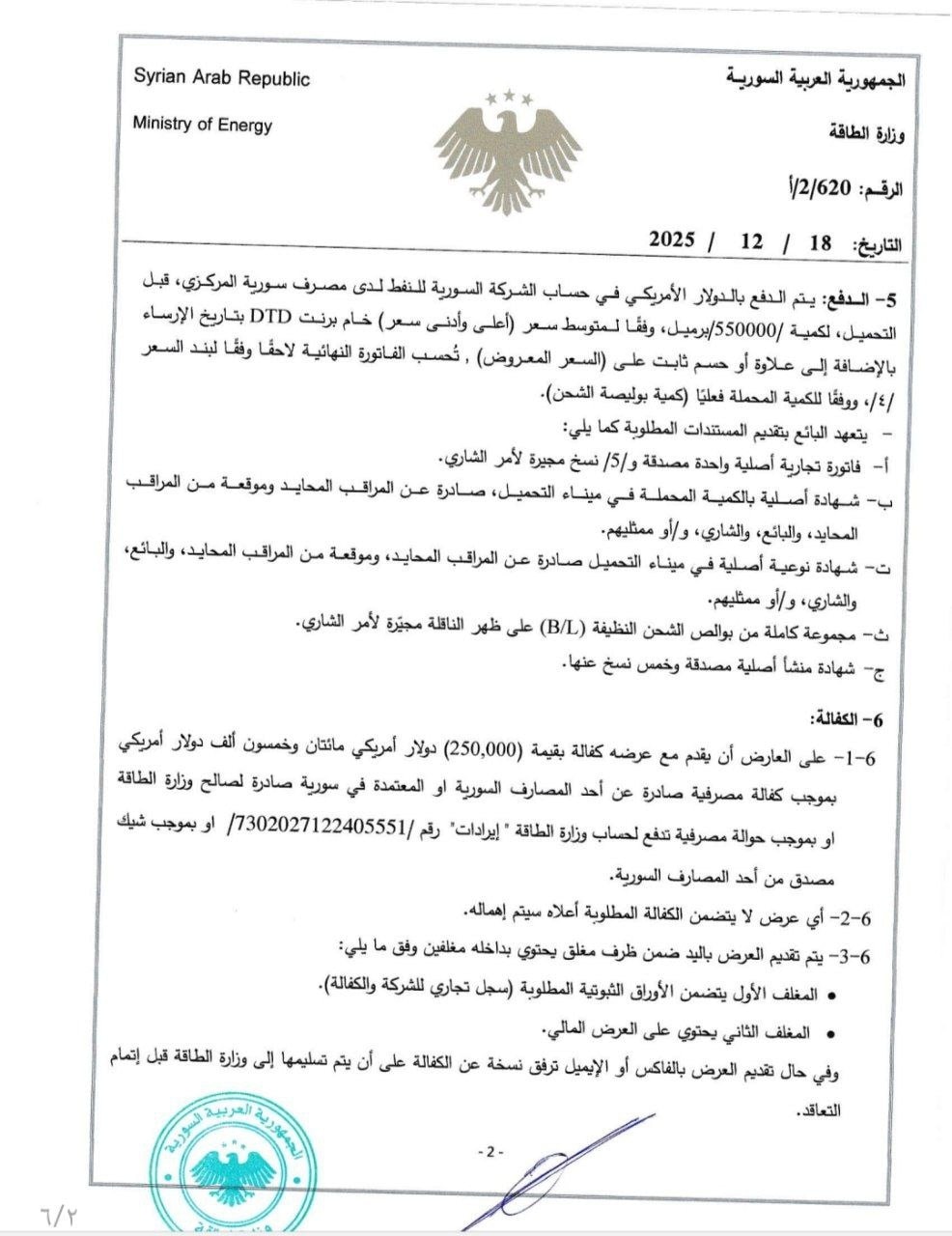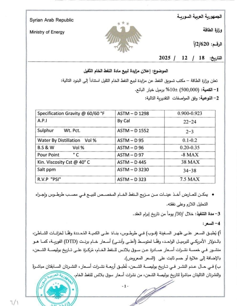 ويتم فض العروض في مبنى وزارة الطاقة مكتب تسويق النفط بحضور العارضين أو ممثليهم يوم الثلاثاء 2026/1/20 الساعة /15.00/ بعد الظهر بتوقيت دمشق.