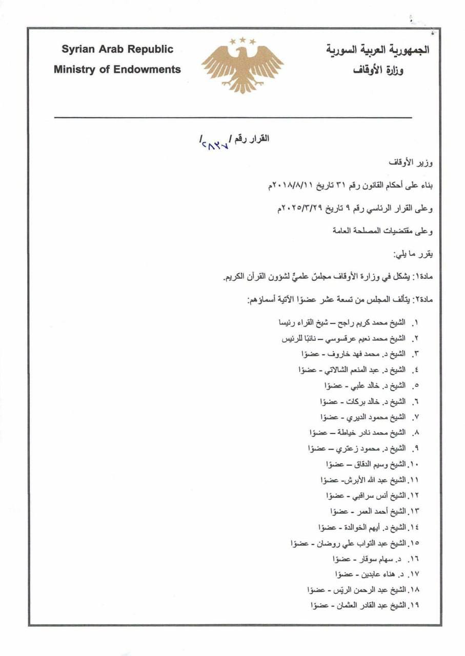 مادة /١/: يُشكّل في وزارة الأوقاف مجلس علمي لشؤون القرآن الكريم.