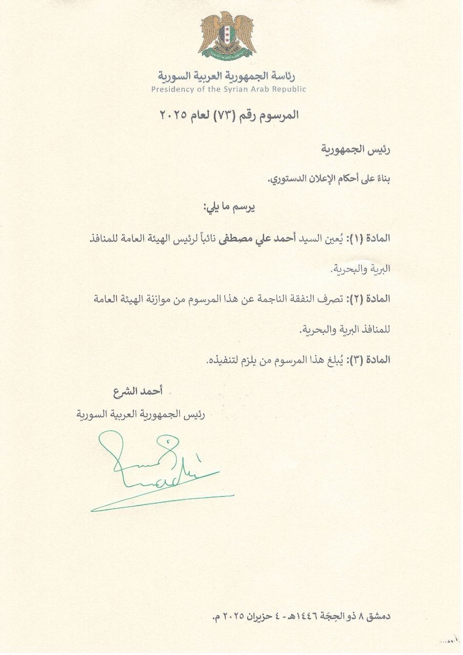 مرسوم رئاسي رقم (73) لعام 2025 يقضي بتعيين السيد "أحمد علي مصطفى" نائباً لرئيس الهيئة العامة للمنافذ البرية والبحرية.