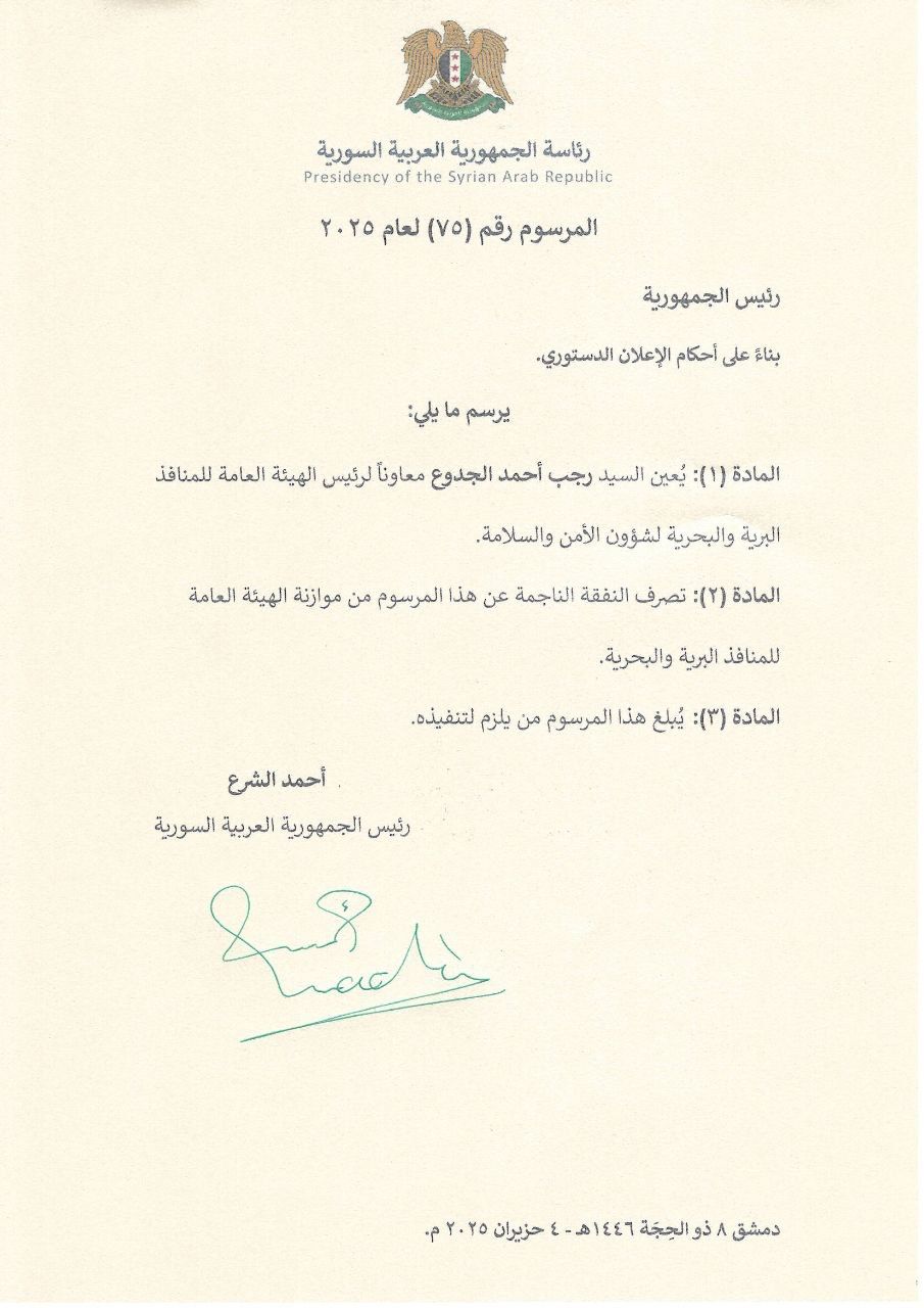 المرسوم 75 لعام 2025: تعيين رجب أحمد الجدوع معاونًا لرئيس الهيئة العامة للمنافذ البرية والبحرية لشؤون الأمن والسلامة
