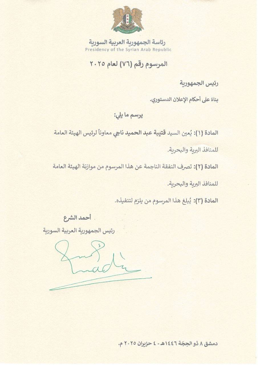 مرسوم رئاسي رقم (76) لعام 2025 يقضي بتعيين السيد "قتيبة عبد الحميد ناجي" معاوناً لرئيس الهيئة العامة للمنافذ البرية والبحرية.