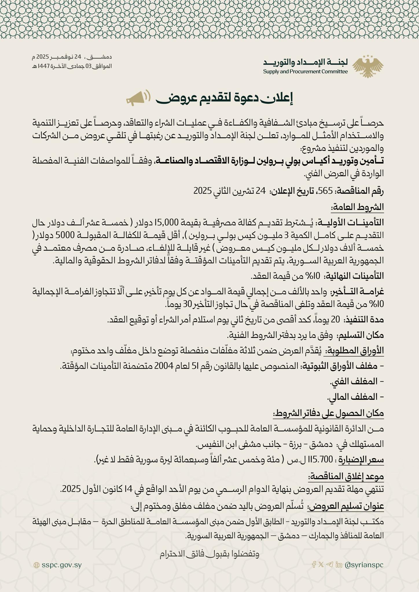 إعلان رسمي صادر عن لجنة الإمداد والتوريد يدعو الشركات والموردين إلى تقديم عروض لتأمين وتوريد أكياس بولي برولين لصالح وزارة الاقتصاد والصناعة، موضحاً رقم المناقصة وشروط التأمين والتنفيذ، والمتطلبات الفنية والمالية، ومواعيد ومكان تقديم العروض.