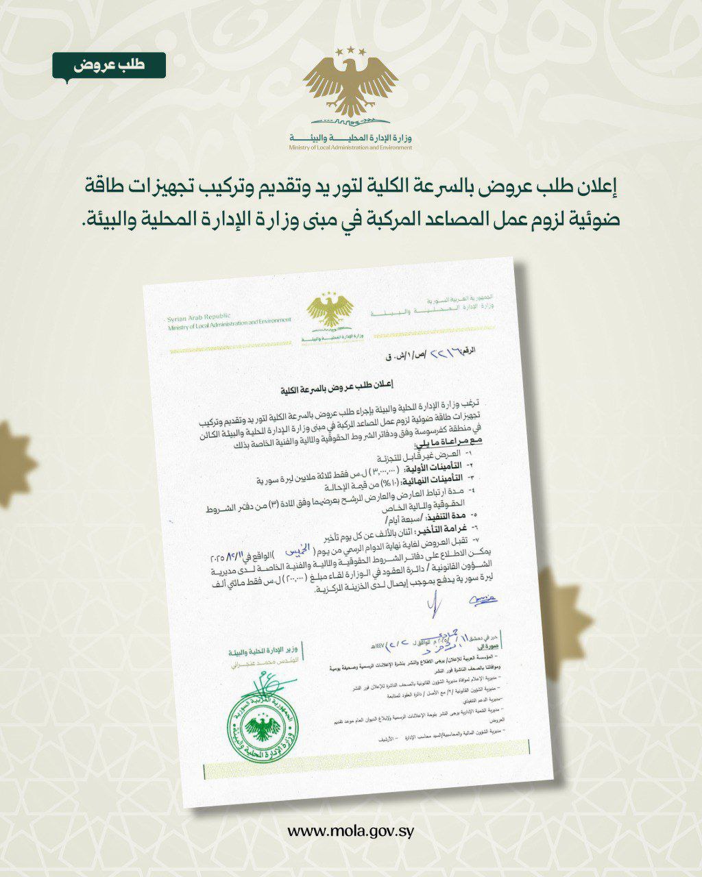 ترغب وزارة الإدارة المحلية والبيئة بإجراء طلب عروض بالسرعة الكلية لتوريد وتقديم وتركيب تجهيزات طاقة ضوئية لزوم عمل المصاعد المركبة في مبنى وزارة الإدارة المحلية والبيئة الكائن في دمشق، وذلك وفق جدول الكميات والشروط الحقوقية والمالية والفنية الخاصة بذلك.