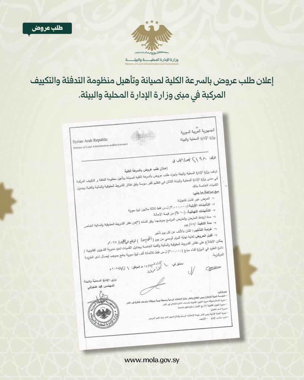 ترغب وزارة الإدارة المحلية والبيئة بإجراء طلب عروض بالسرعة الكلية لصيانة وتأهيل منظومة التدفئة والتكييف المركبة في مبنى وزارة الإدارة المحلية والبيئة الكائن في دمشق، وذلك وفق نظام كسر موسوعة ووفق دفاتر الشروط الحقوقية والمالية والفنية الخاصة وجداول الكميات.