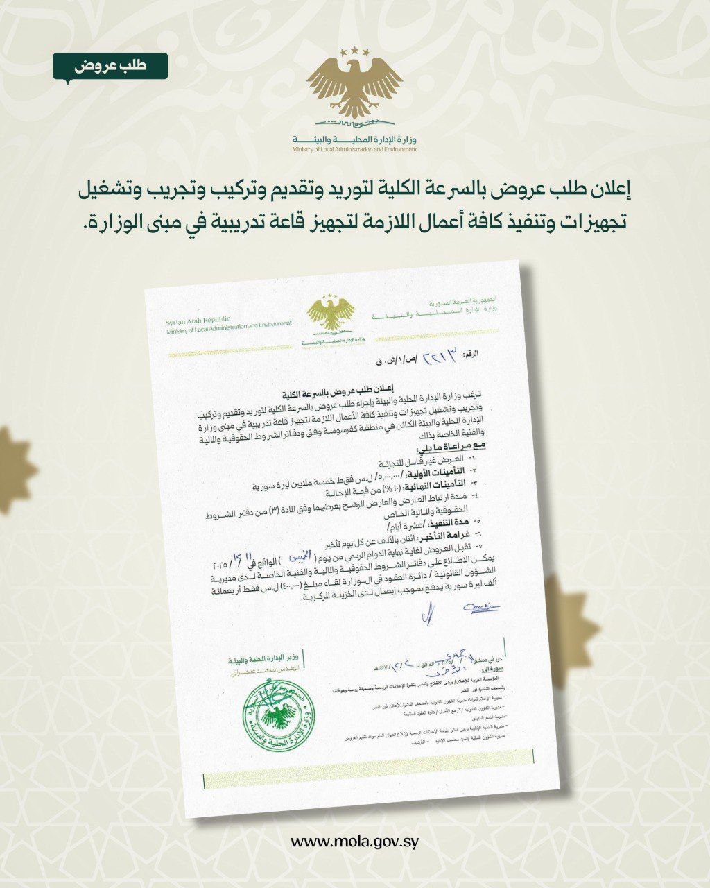 ترغب وزارة الإدارة المحلية والبيئة بإجراء طلب عروض بالسرعة الكلية لتوريد وتقديم وتركيب وتجريب وتشغيل تجهيزات وتنفيذ كافة الأعمال اللازمة لتجهيز قاعة تدريبية في مبنى وزارة الإدارة المحلية والبيئة، وفق نظام كسر موسوعة، ووفق دفاتر الشروط الحقوقية والمالية والفنية الخاصة وجداول الكميات.