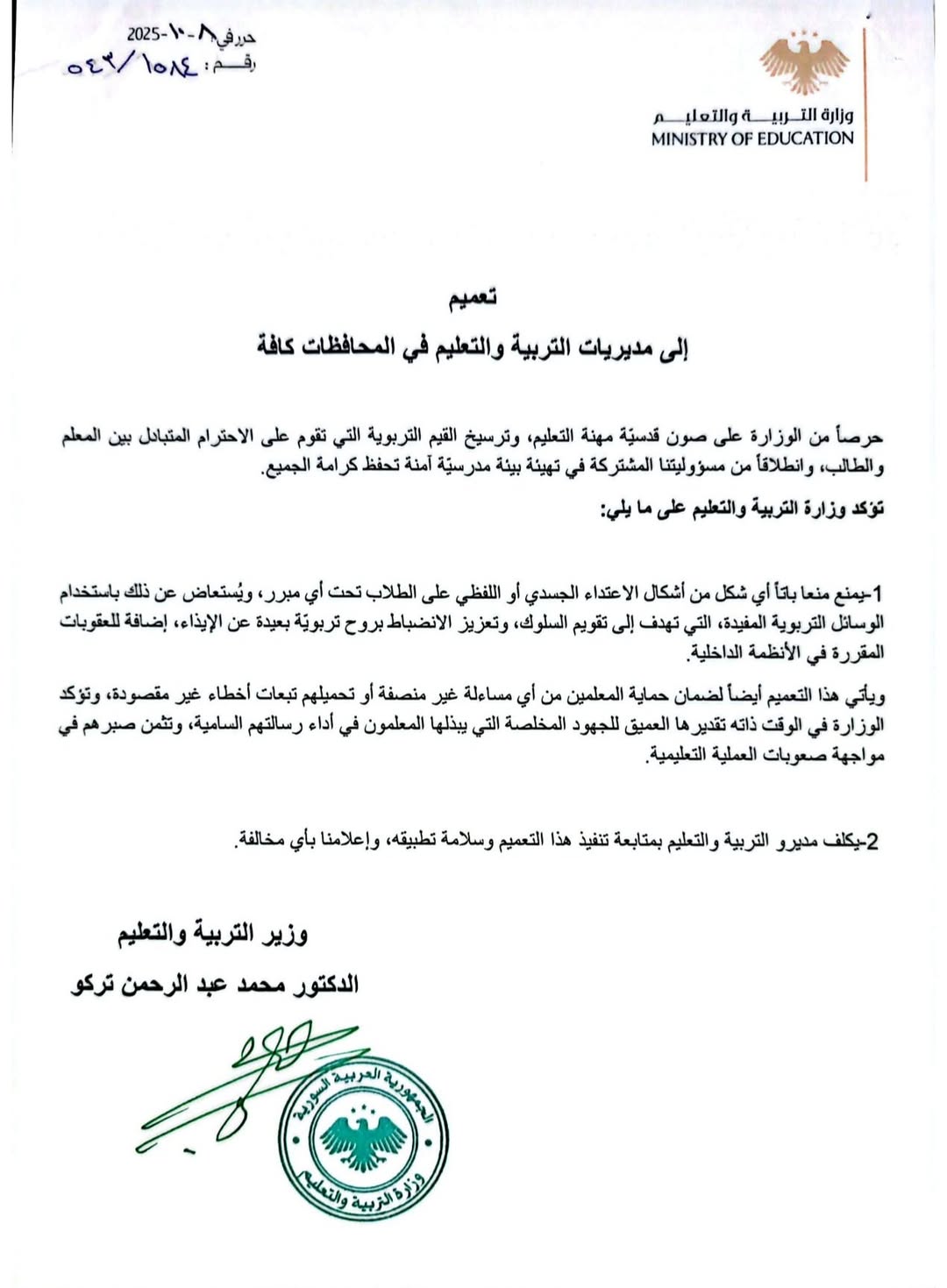 حرصاً من الوزارة على صون قدسية مهنة التعليم، وترسيخ القيم التربوية التي تقوم على الاحترام المتبادل بين المعلم والطالب، وانطلاقاً من مسؤوليتنا المشتركة في تهيئة بيئة مدرسية آمنة تحفط كرامة الجميع.