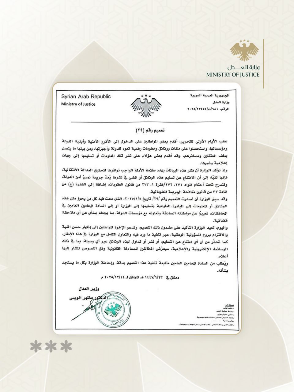 وإذ تؤكد الوزارة أن نشر هذه البيانات يهدد سلامة الأدلة الواجب توافرها لتحقيق العدالة الانتقالية، فإنها تنبه إلى أن الامتناع عن تسليم هذه الوثائق أو إخفائها أو التصرف بها يشكل جرماً يعاقب عليه القانون، وذلك عملاً بأحكام المادتين /277/ و/278/ من قانون العقوبات، إضافة إلى الفقرة (ج) من المادة /3/ من قانون مكافحة الجرائم المعلوماتية.