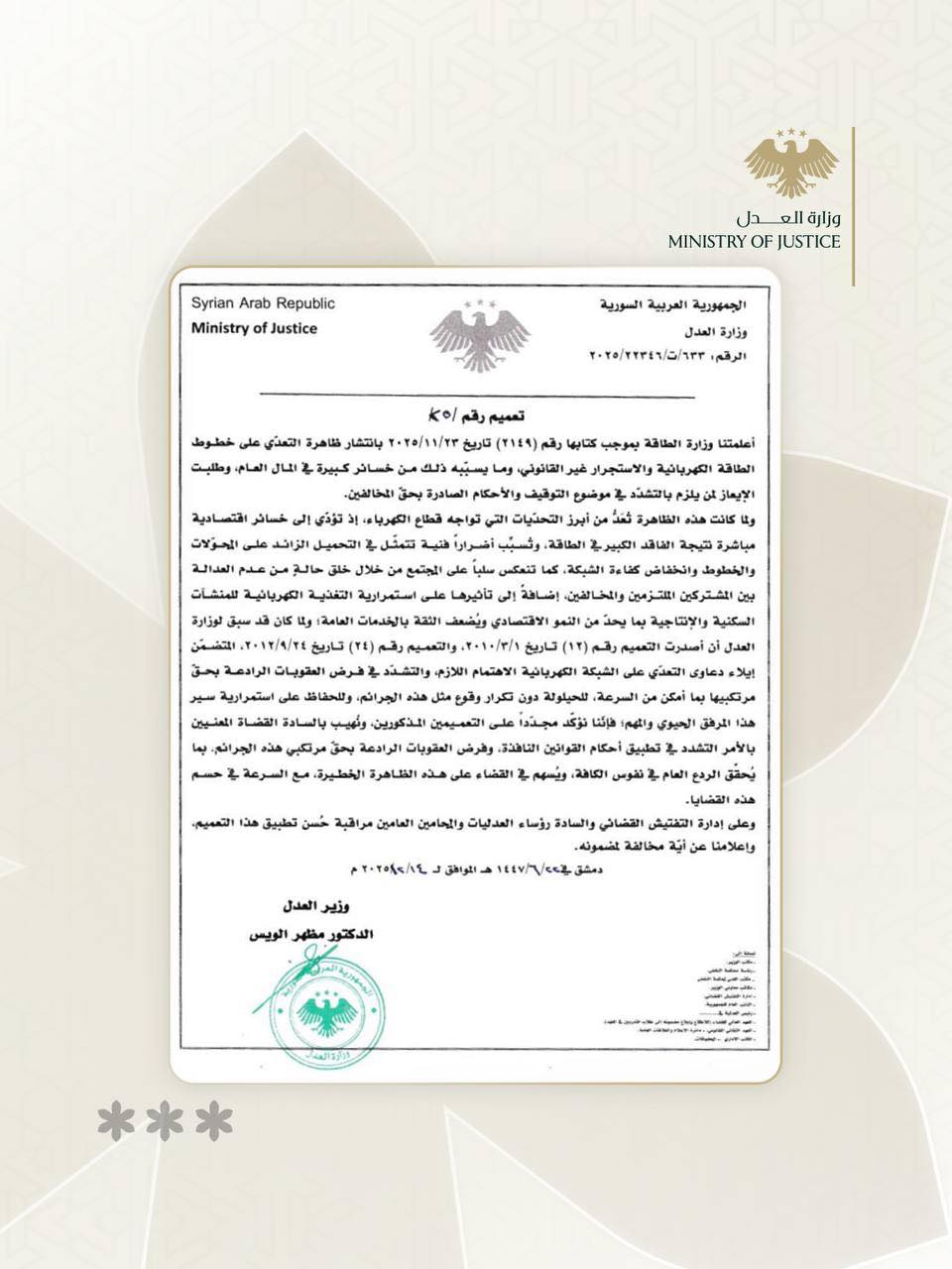 وبما أن وزارة العدل كانت قد سبق لها أن أصدرت التعميم رقم (12) تاريخ 3/1/2025، والتعميم رقم (24) تاريخ 4/11/2025، المتضمنين إبلاغ دعاوى التعدي على الشبكة الكهربائية الاهتمام اللازم والتشدد في فرض العقوبات الرادعة بحق مرتكبيها بما أمكن من السرعة للحيلولة دون تكرار وقوع مثل هذه الجرائم، والحفاظ على استمرارية سير هذا المرفق الحيوي الذي ينعكس على الصالح العام والمواطنين، وتكليف السادة القضاة العدليين بالأخذ بالتشدد في تطبيق أحكام القوانين النافذة، وفرض العقوبات الرادعة بحق مرتكبي هذه الجرائم، بما يحقق الردع العام وفق النصوص الكفيلة، ويسهم في القضاء على هذه الظاهرة الخطيرة، مع السرعة في حسم هذه القضايا.