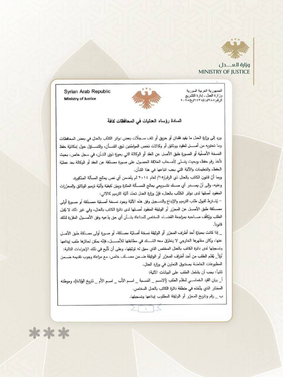 نرغب إليكم الاطلاع وتعميم ذلك كلياً على المحاكم والدوائر القضائية المعنية وخاصة دوائر الكاتب بالعدل في عدالتكم، للعمل وفق مضمونه كلما لزم الأمر أصولاً.