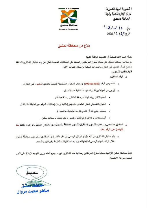 تؤكد محافظة دمشق التزامها بحماية حقوق المواطنين وسلامة السكنات، وتدعو جميع المتضررين إلى الإبلاغ عن أي إزعاج لضمان سرعة الاستجابة.