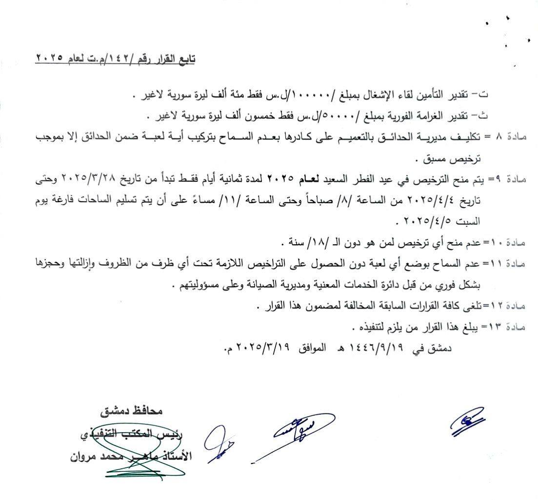 تكلف مديرية دوائر الخدمات ومديرية الصيانة وقسم شرطة مجلس محافظة دمشق إزالة جميع الألعاب التي توضع خارج المواقع المحددة وفي الحدائق وحجز الآليات والسيارات المخالفة.