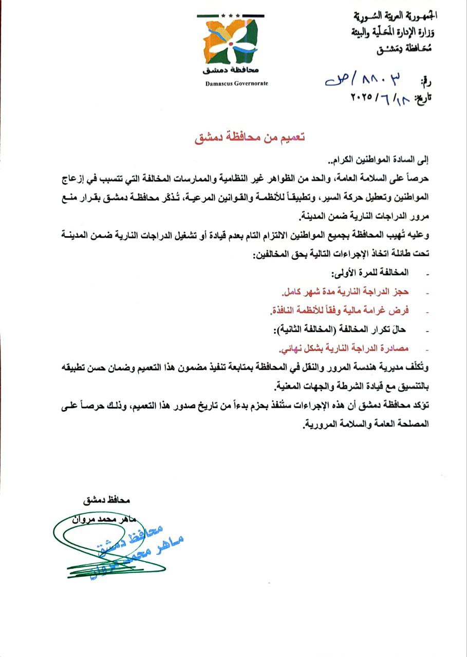تؤكد محافظة دمشق أن هذه الإجراءات ستُنفَّذ بحزم بدءاً من تاريخ صدور هذا التعميم، وذلك حرصاً على المصلحة العامة والسلامة المرورية.