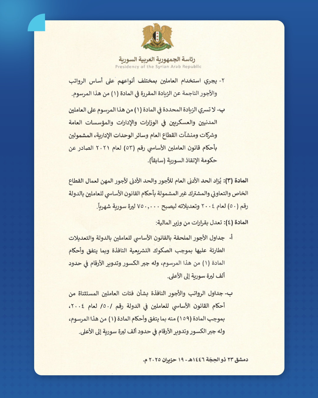 يزاد الحد الأدنى العام للأجور والحد الأدنى لأجور المهن لعمال القطاع الخاص والتعاوني والمشترك غير المشمولة بأحكام القانون الأساسي للعاملين بالدولة رقم (50) لعام 2004 وتعديلاته ليصبح /750,000/ ليرة سورية شهرياً.