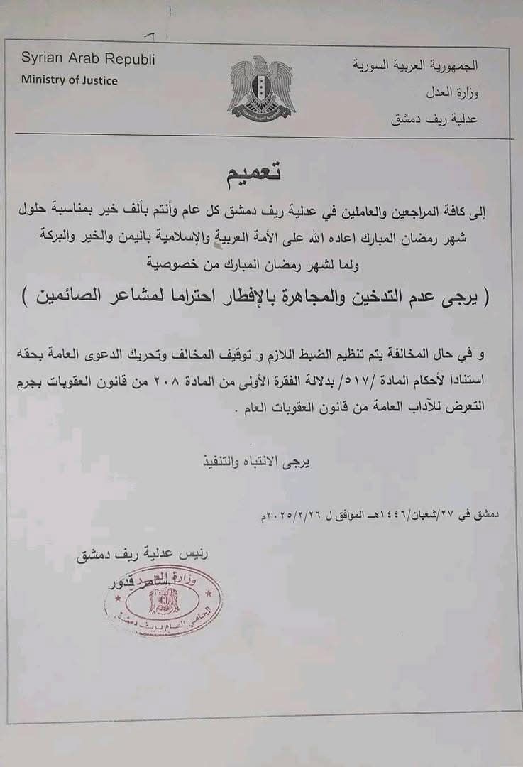 عدلية ريف دمشق: توقيف كل من يجاهر بالإفطار في رمضان