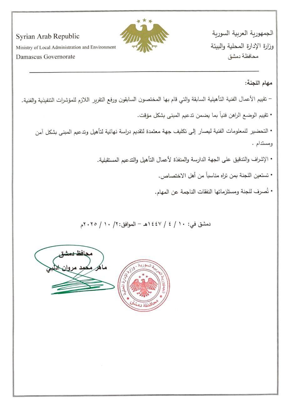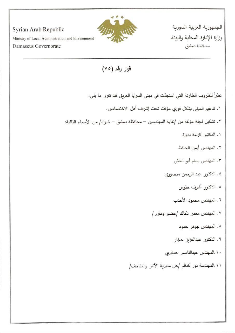 محافظة دمشق: قرار رقم 75 القاضي بتدعيم مبنى السرايا العريق وتشكيل لجنة فنية متخصصة لتقييمه وتأهيله