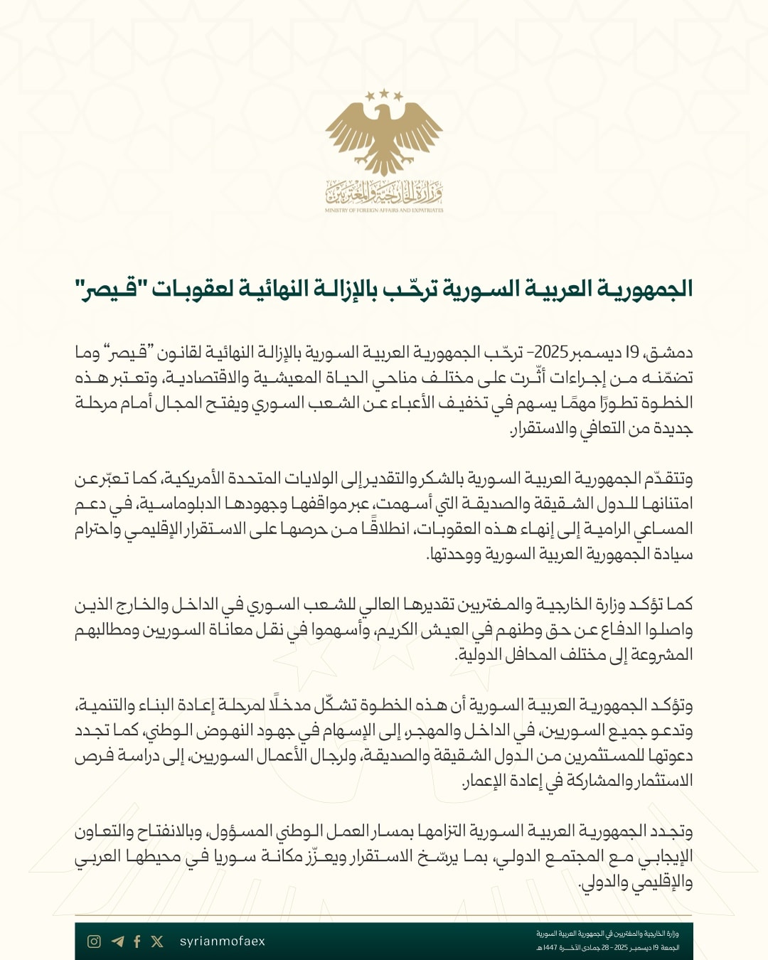 دمشق، 19 ديسمبر 2025 – ترحب الجمهورية العربية السورية بالإزالة النهائية لقانون "قيصر" وما تضمنه من إجراءات أثرت على مختلف مناحي الحياة المعيشية والاقتصادية، وتعتبر هذه الخطوة تطورًا مهمًا يسهم في تخفيف الأعباء عن الشعب السوري ويفتح المجال أمام مرحلة جديدة من التعافي والاستقرار.