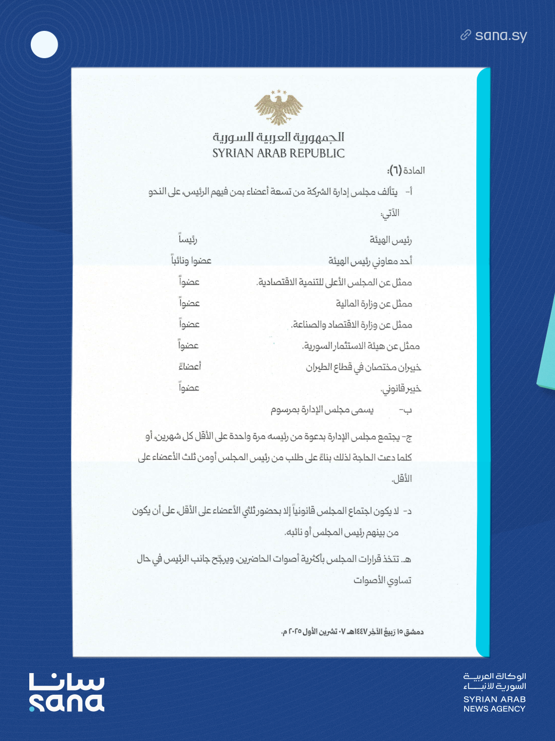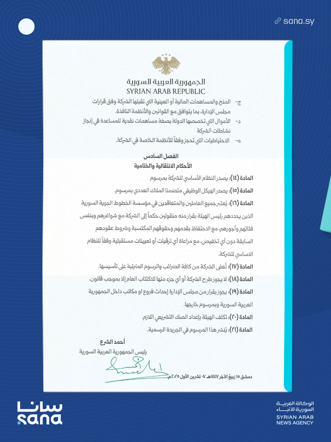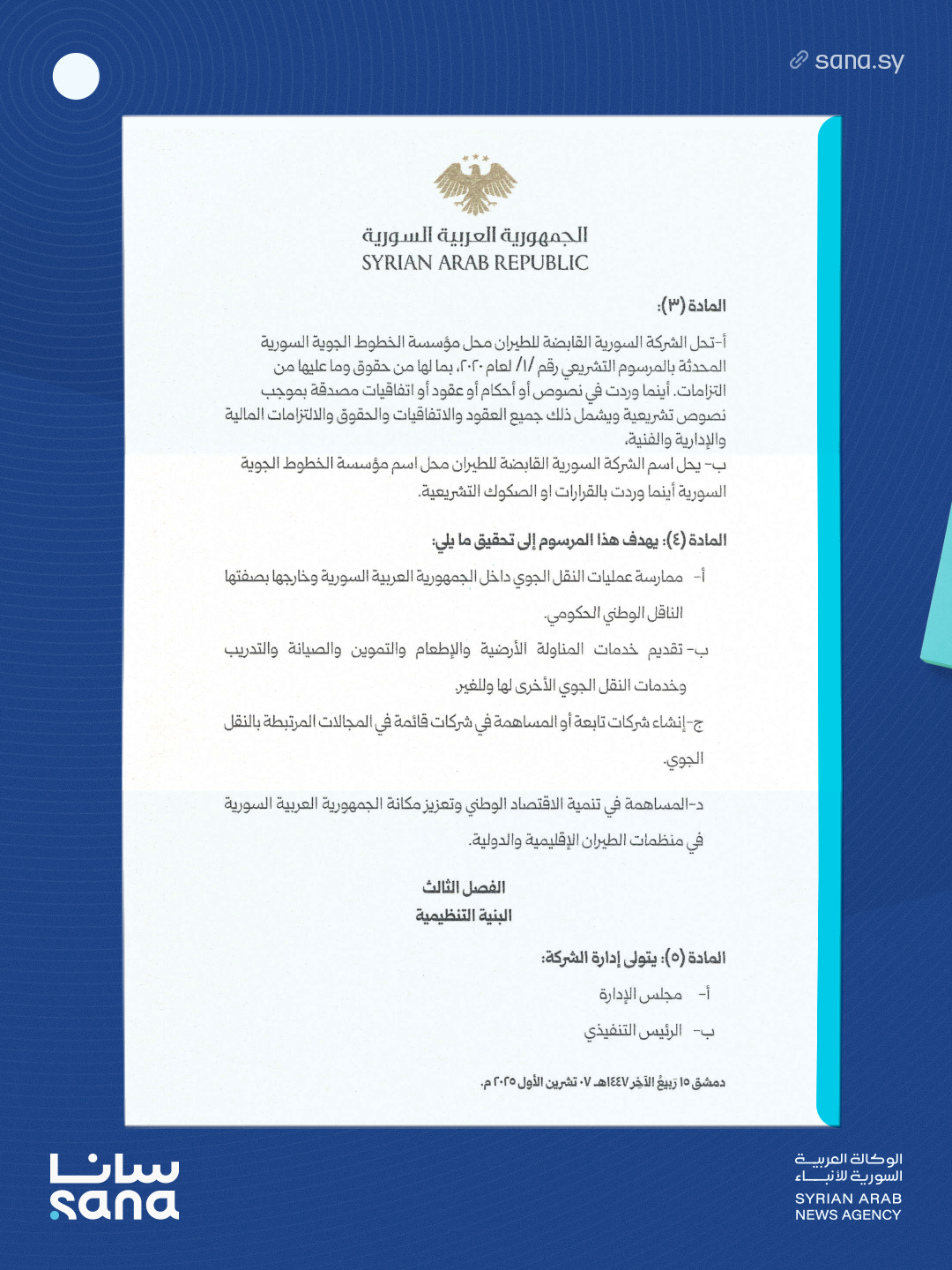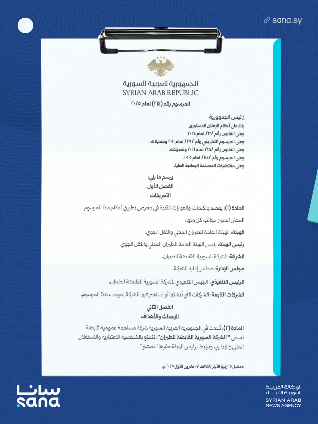 المرسوم 214 لعام 2025: إحداث الشركة السورية القابضة للطيران