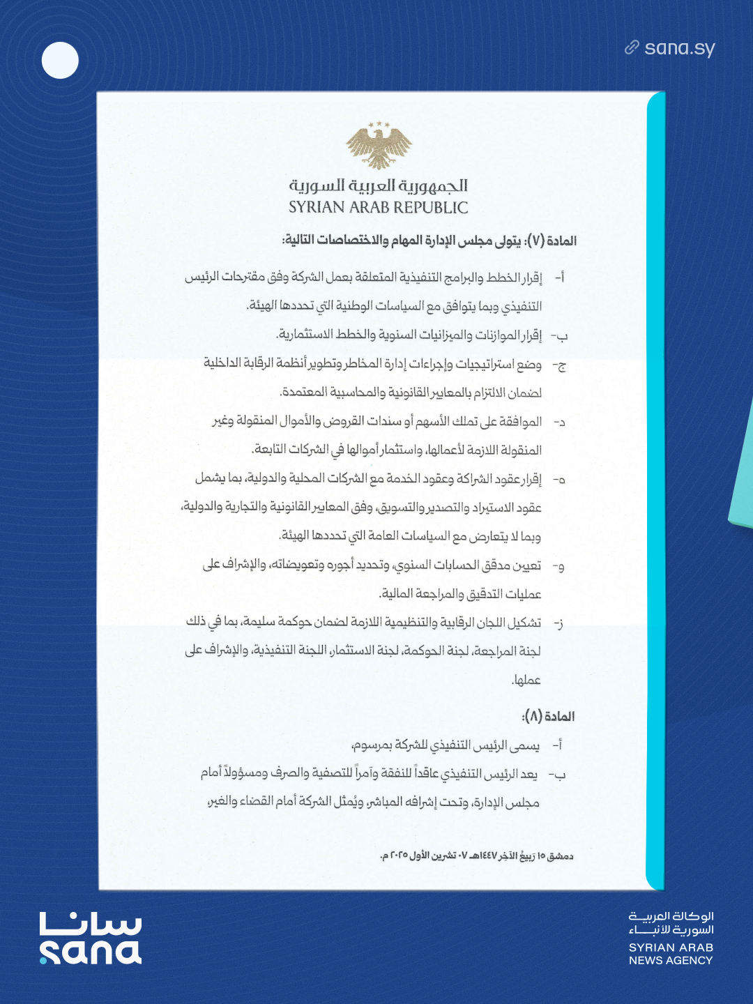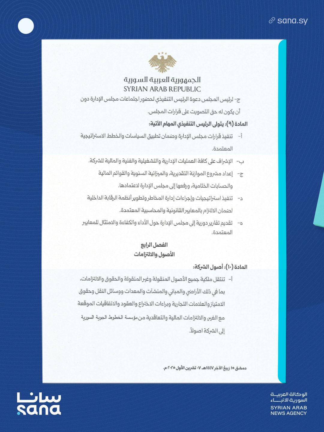 المادة (2): تُحدث في الجمهورية العربية السورية شركة مساهمة عمومية قابضة تسمى “الشركة السورية القابضة للطيران”، تتمتع بالشخصية الاعتبارية والاستقلال المالي والإداري، وترتبط برئيس الهيئة، مقرها “دمشق”.